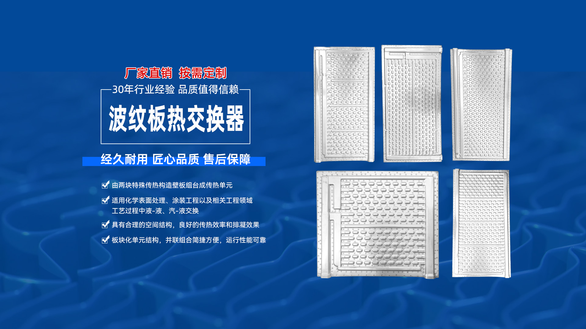 波紋板熱交換器具有合理的空間結(jié)構(gòu),良好的傳熱效率和排凝效果,板塊化單元結(jié)構(gòu),串并聯(lián)組合簡捷方便,運行性能可靠,是當今熱傳遞領(lǐng)域中一種新穎傳熱單元。